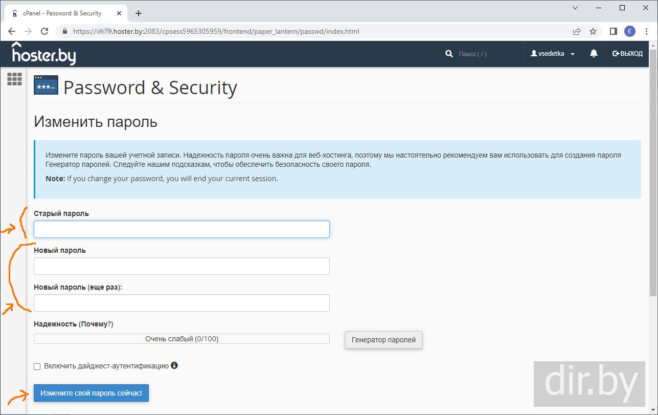 cPanel - меняем пароль на FTP и cPanel (используется один и тот же пароль)