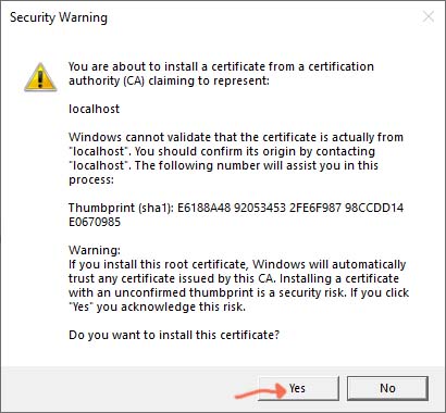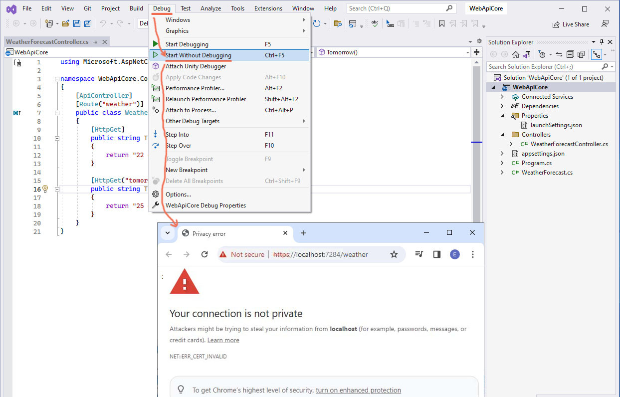 Error "Your connection isn’t private. Attackers might be trying to steal your information from (for example, passwords, messages, or credit cards). NET::ERR_CERT_INVALID" | .NET Core Web API application to C#
