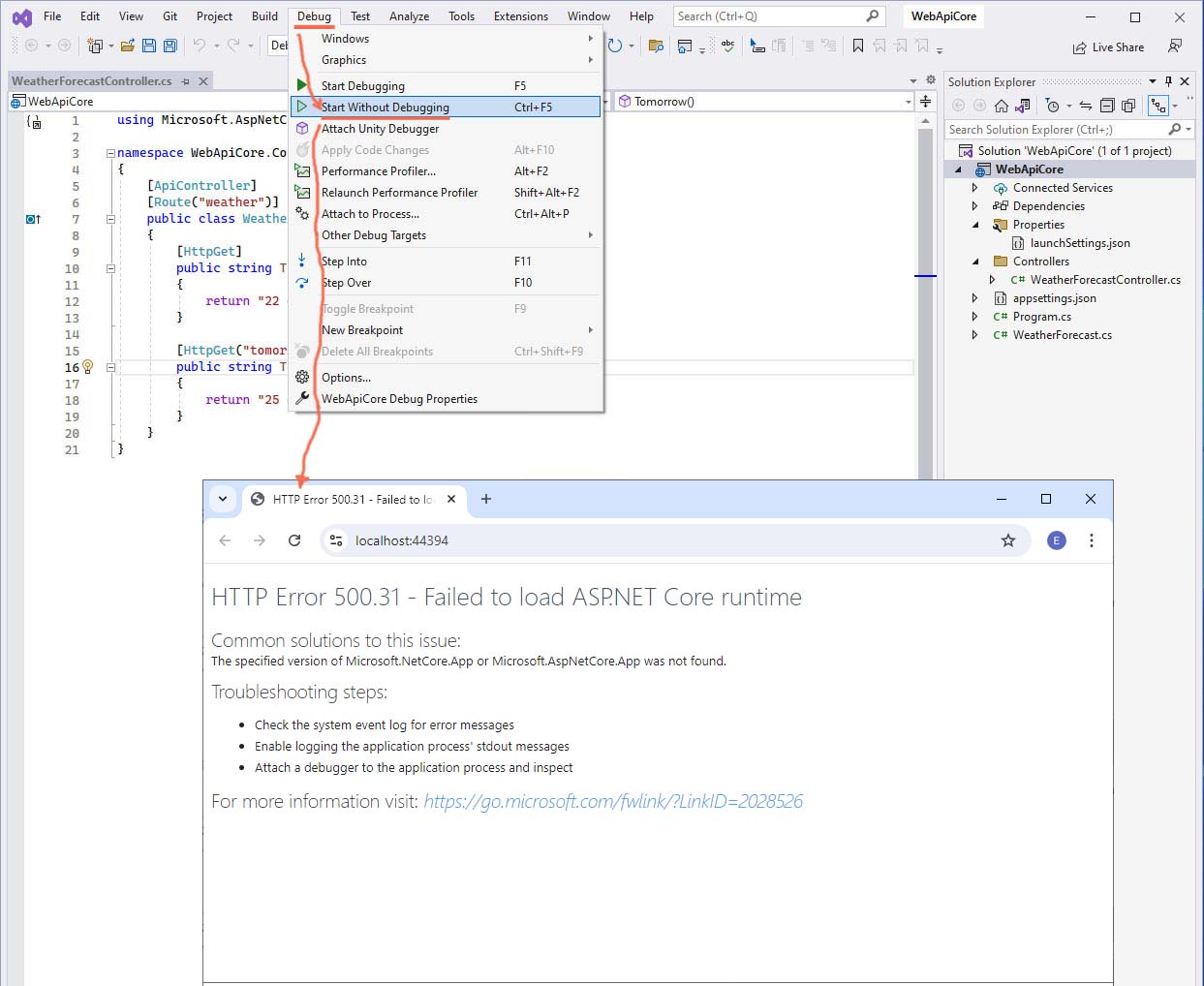 Error "HTTP Error 500.31 - Failed to load ASP.NET Core runtime" | I run .NET Core Web API the application on C#