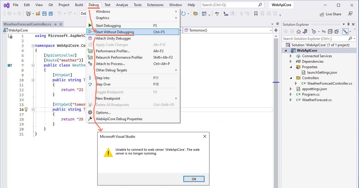 Error "Unable to connect to web server ... The web server is no longer running." | I run .NET Core Web API the application on C#