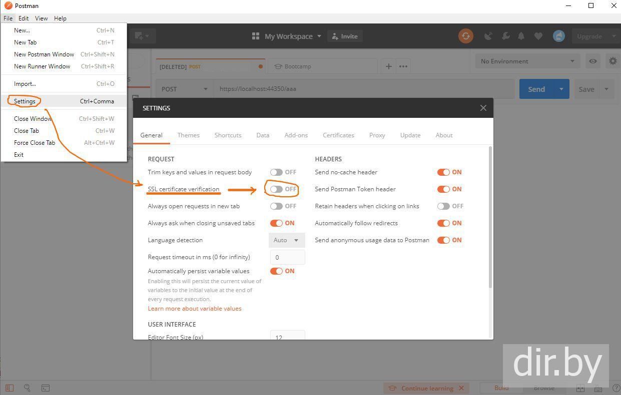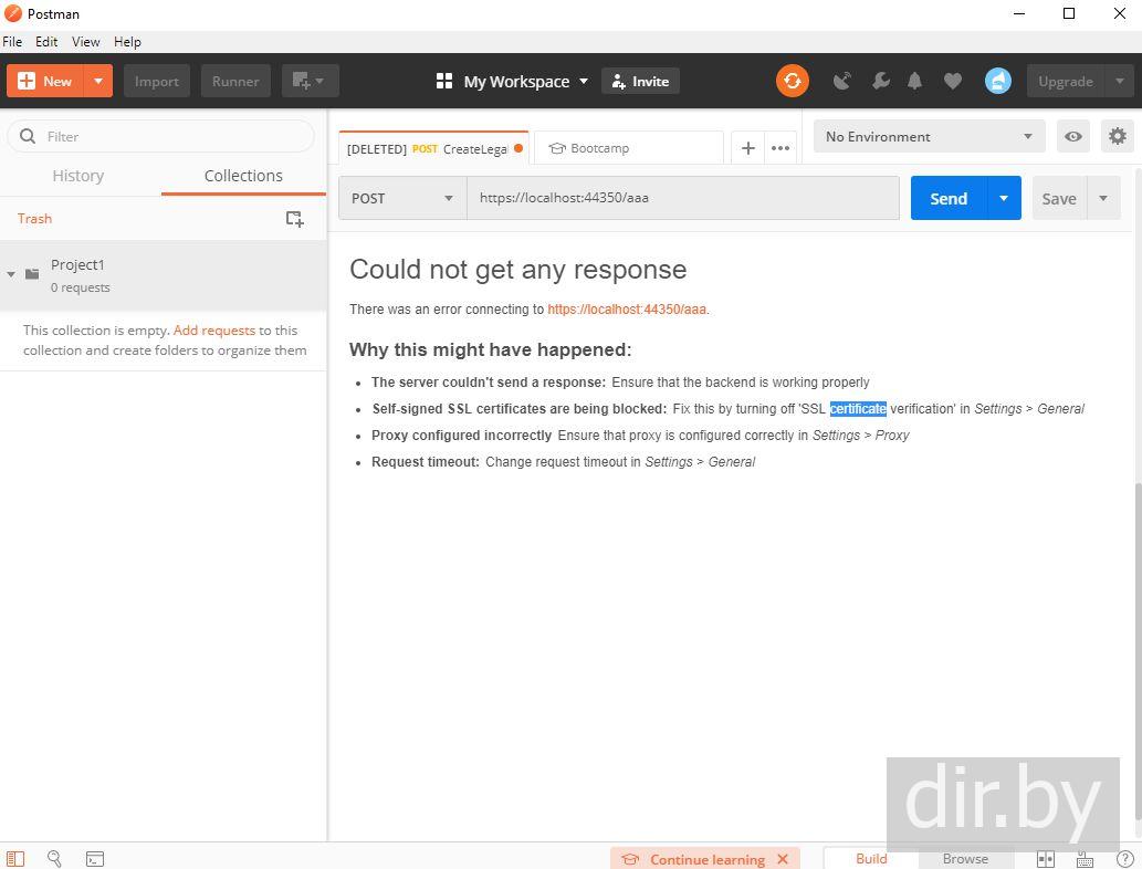PostMan error: Could not get any response. SSL certificate
