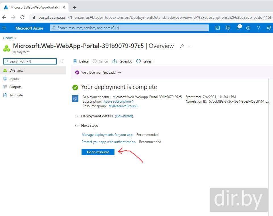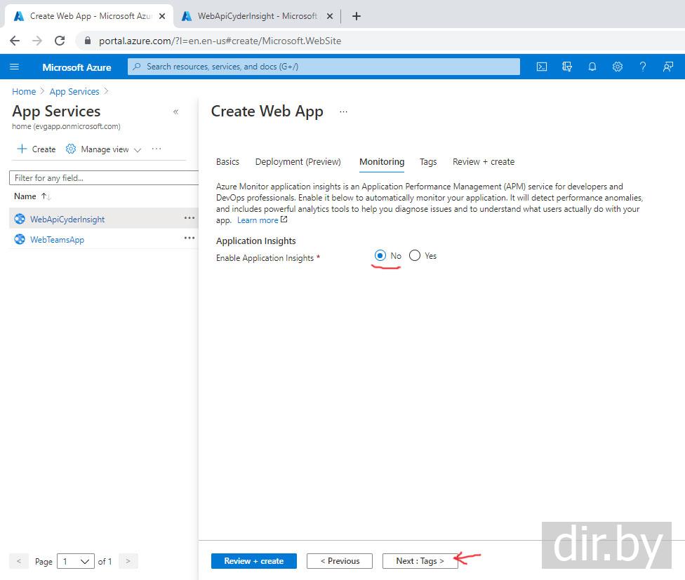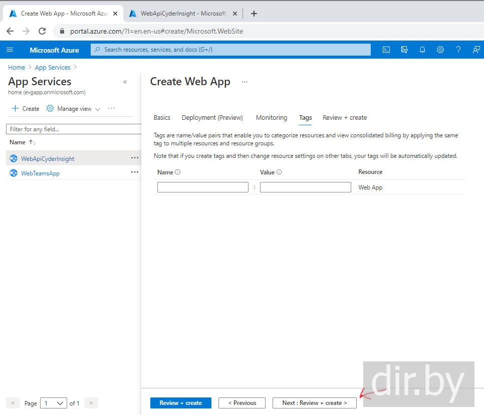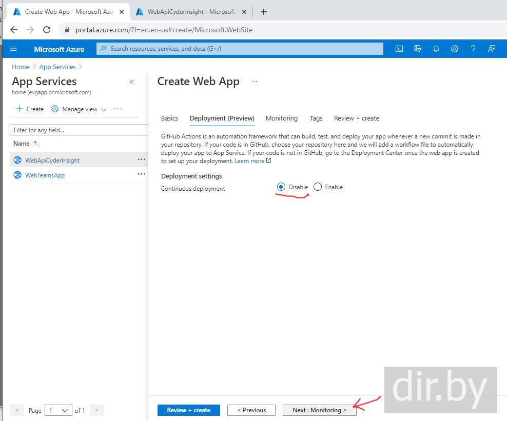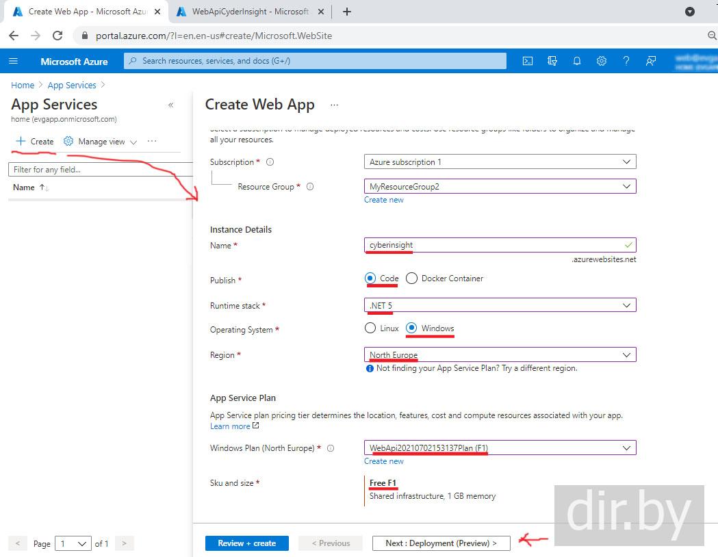 Создаем Azure Web service с типом Net Core 5. То есть создаем пустой web server с типом Net Core 5