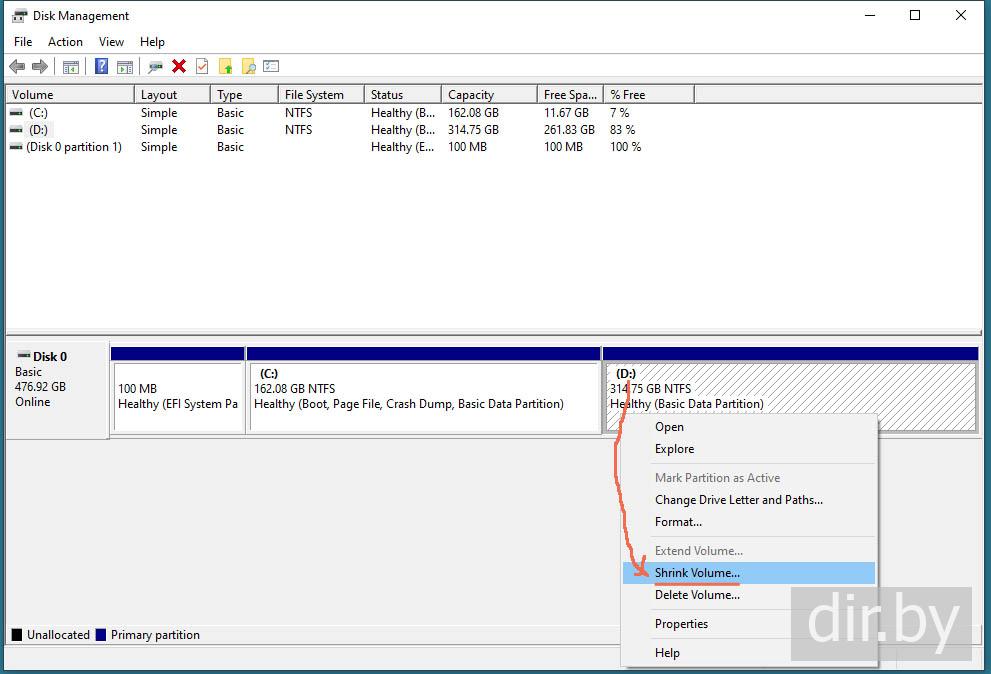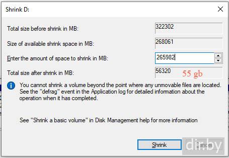 На диске D делаем Shrink на 55 gb