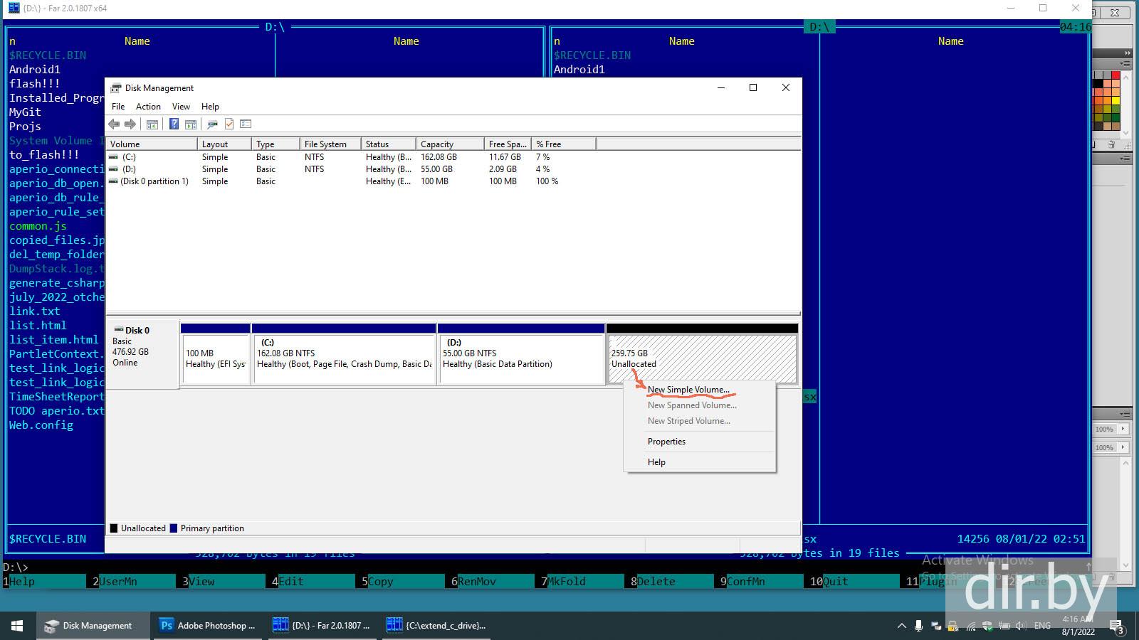 Смотрю на мои диски и думаю на сколько расширить диск C (хочу 55 gb добавить на диск C)