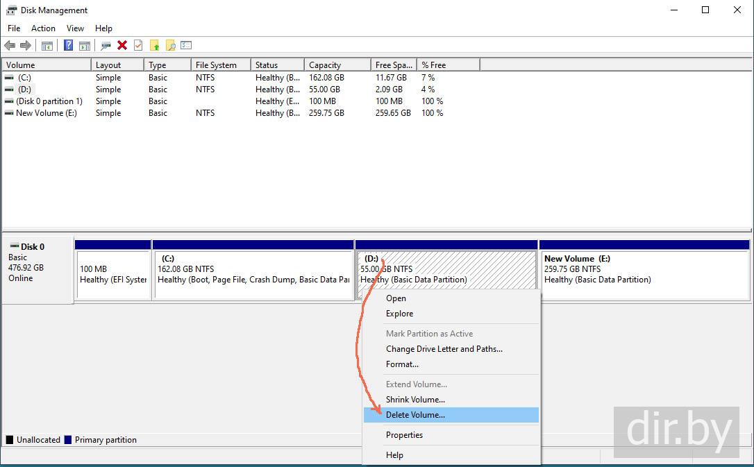 Удаляем диск D