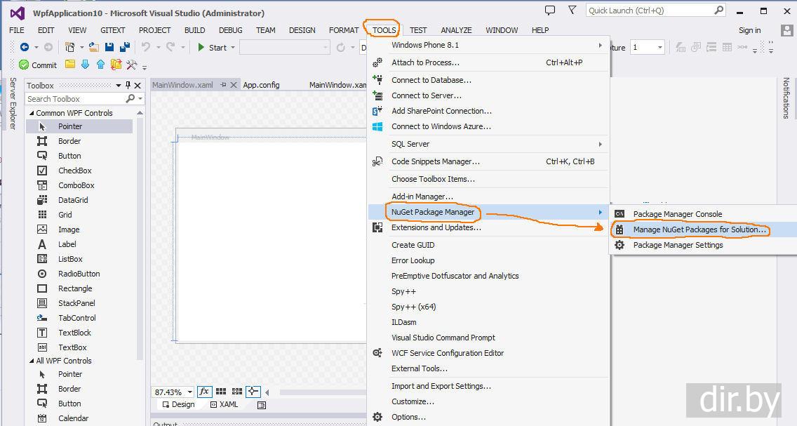 Нажимаем в меню: Tools → NuGet Package Manager → Manage NuGet Packages for Solution...