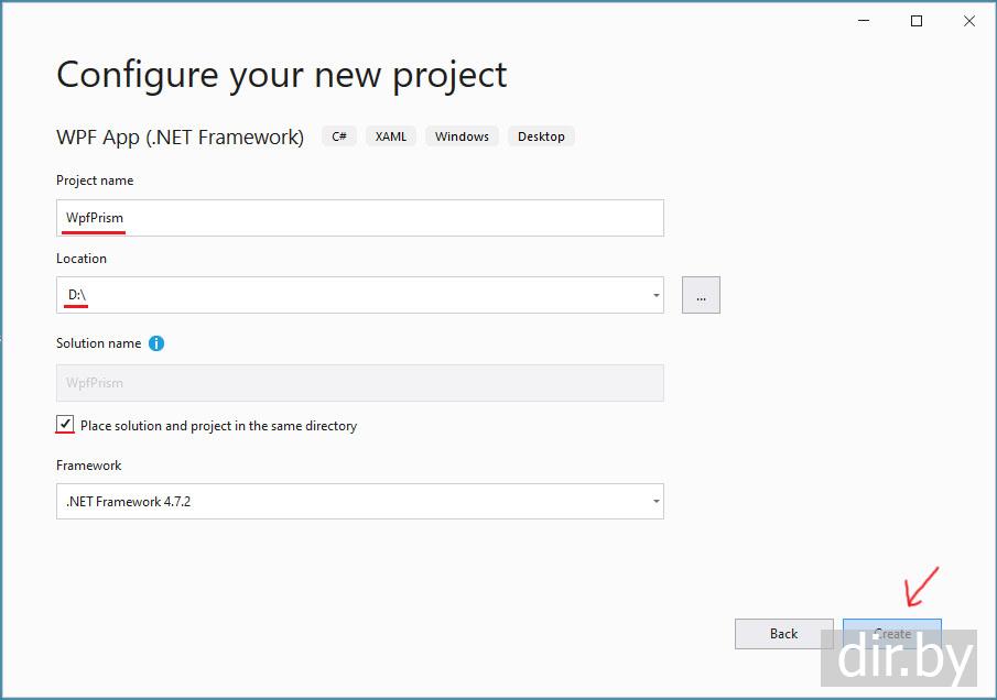 Пишем название проекта WpfPrism (название проекта может быть любым)