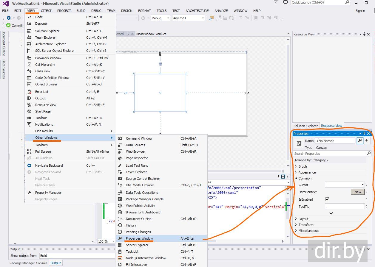 Открываем окно свойств (properties) для графического элемента в WPF приложении C#
