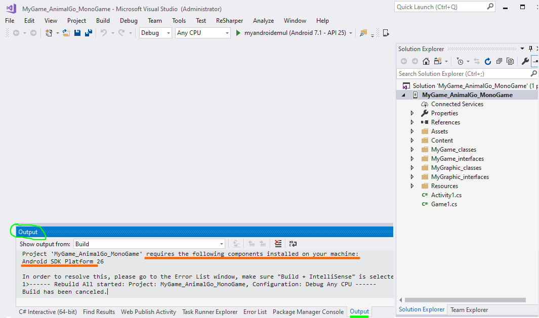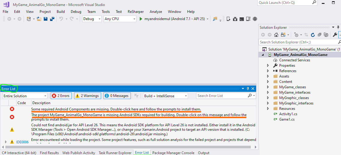 The project 'MyGame_AnimalGo_MonoGame' is missing Android SDKs required for building. Double-click on this message and follow the prompts to install them.