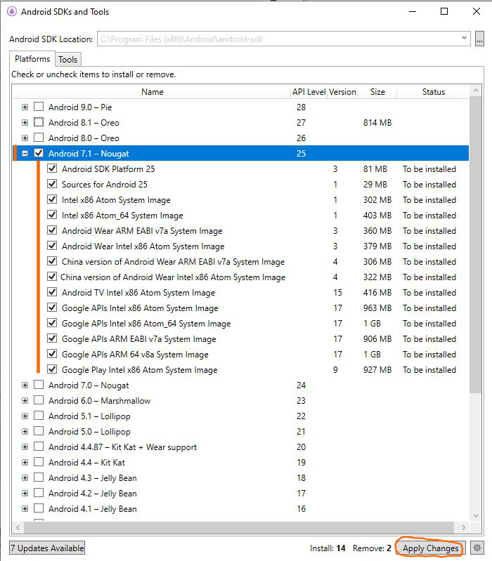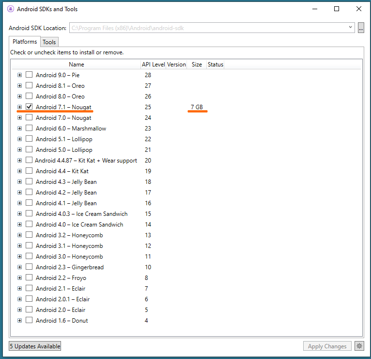 Инсталлирование Android платформы (SDK 7.1.1 API 25) в Visual Studio 2017