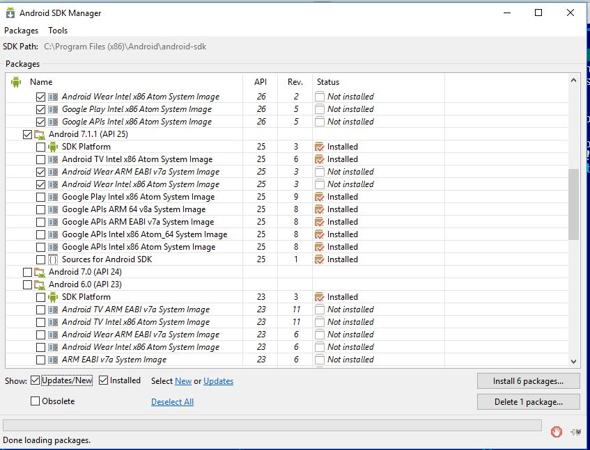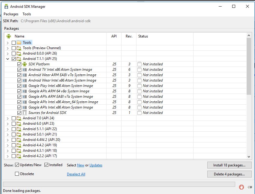 Появится окно "Android SDK and Tools" у меня список версий Android пуст