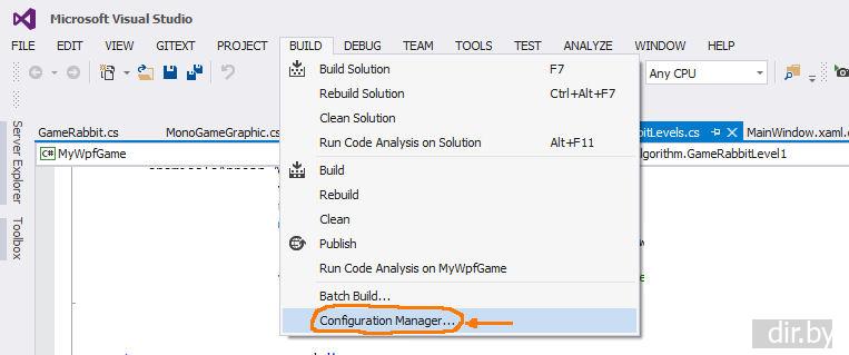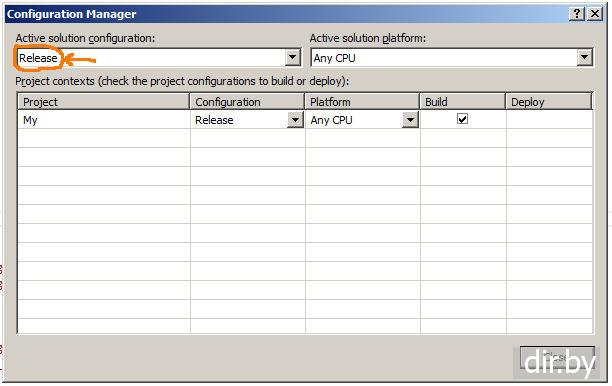В меню нажимаем BuildConfiguration Manager → Active Solution Configuration: Release