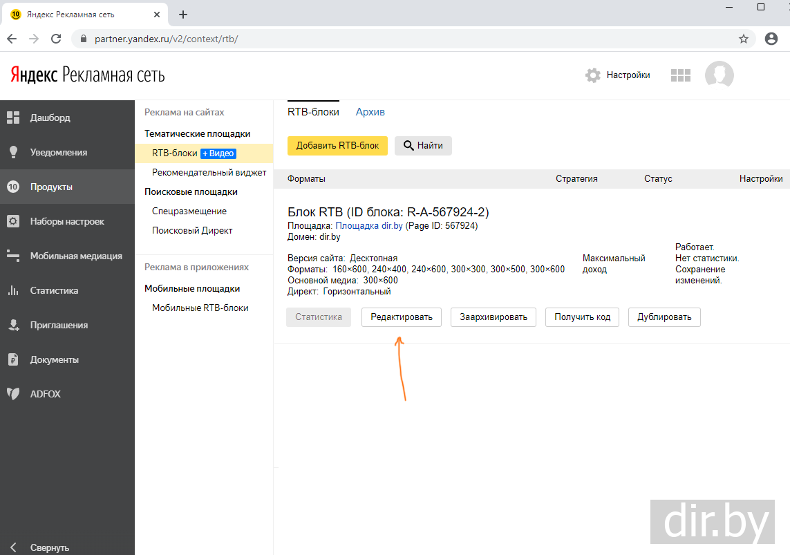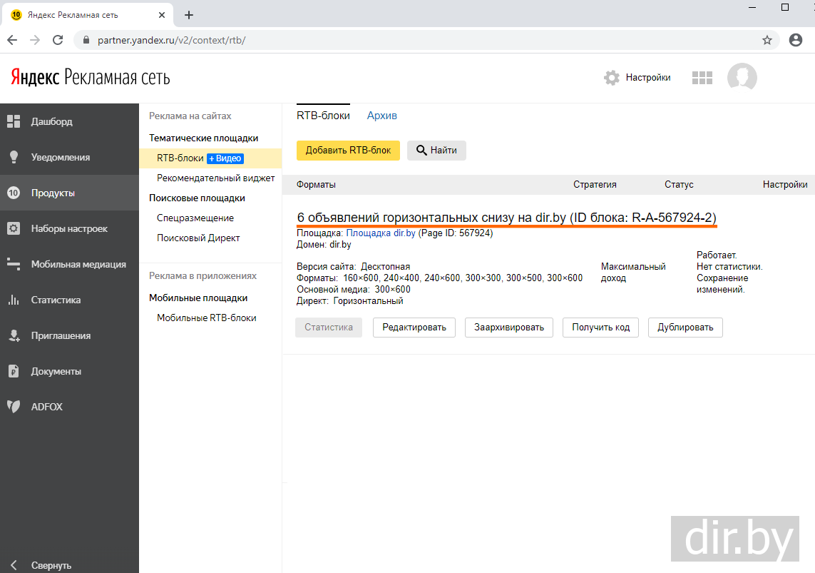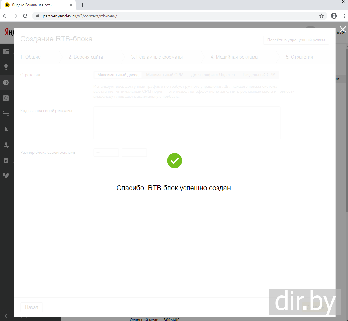 Увидим что рекламный блок успешно создан