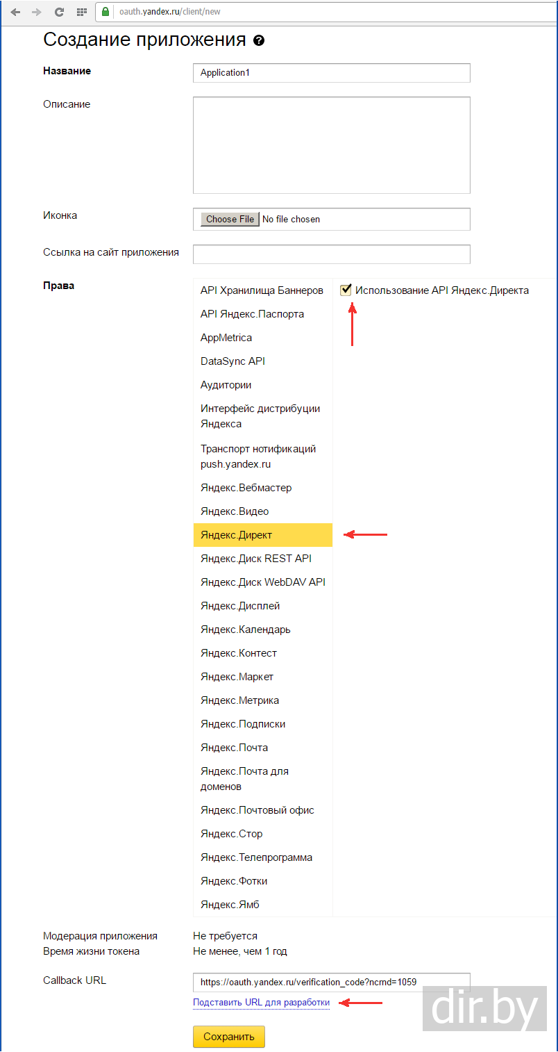 Права в разделе «Яндекс.Директ» установите флажок «Использование API Яндекс.Директа», чтобы получить доступ к управлению рекламными материалами. Набор прав приложения также виден всем его потенциальным пользователям.