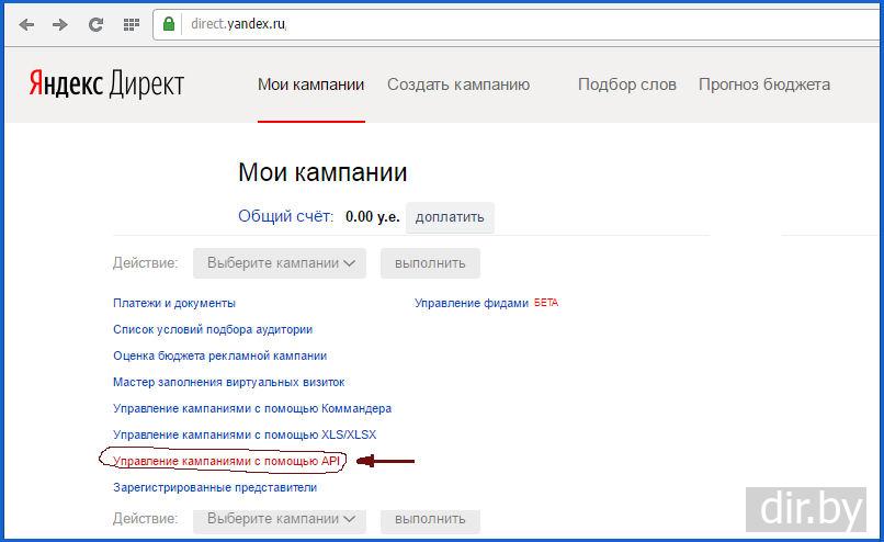 "Управление кампаниями с помощью API" и нажать