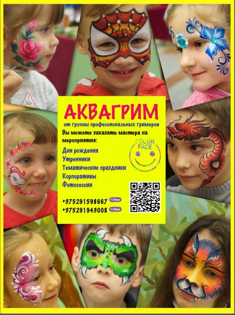 Аквагрим, боди арт, пластичный грим, блеск тату, аэро тату, мехенди, макияж, прически( создание полного образа), фотография, декорирование, бутафория. Презентабельный внешний вид, униформа. Дни рождения Фестивали Утренники Тематические праздники Перфомансы Спортивные мероприятия PR компании Мастер классы Квесты Корпоративы Фотосессии За нами профессионализм, качество, ответственность. Выезд по Минску и РБ на любое Ваше мероприятие. Так же принимаем зарубежные заказы. Любая форма оплаты. Вся информация тут www.instagram.com/color_face_minsk На последнем городском мероприятии "БэбиЭкспо", мы представили новую услугу по созданию образа( грим+прическа). |