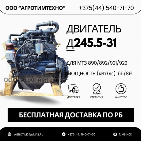 Капитальный ремонт двигателя ММЗ д245.5-31 для трактора беларус-890/892/921/922/950/952 или двигатель с обменного фонда (цену на ремонт ДВС и наличие указанной модификации двигателя в ремфонде уточнять!). Забор двигателя и доставка после капитального ремонта осуществляется Исполнителем (ООО «АгроТимТехно») БЕСПЛАТНО. При наличии двигателя в обменном фонде доставка осуществляется в течение 1-2 дней после оплаты.
