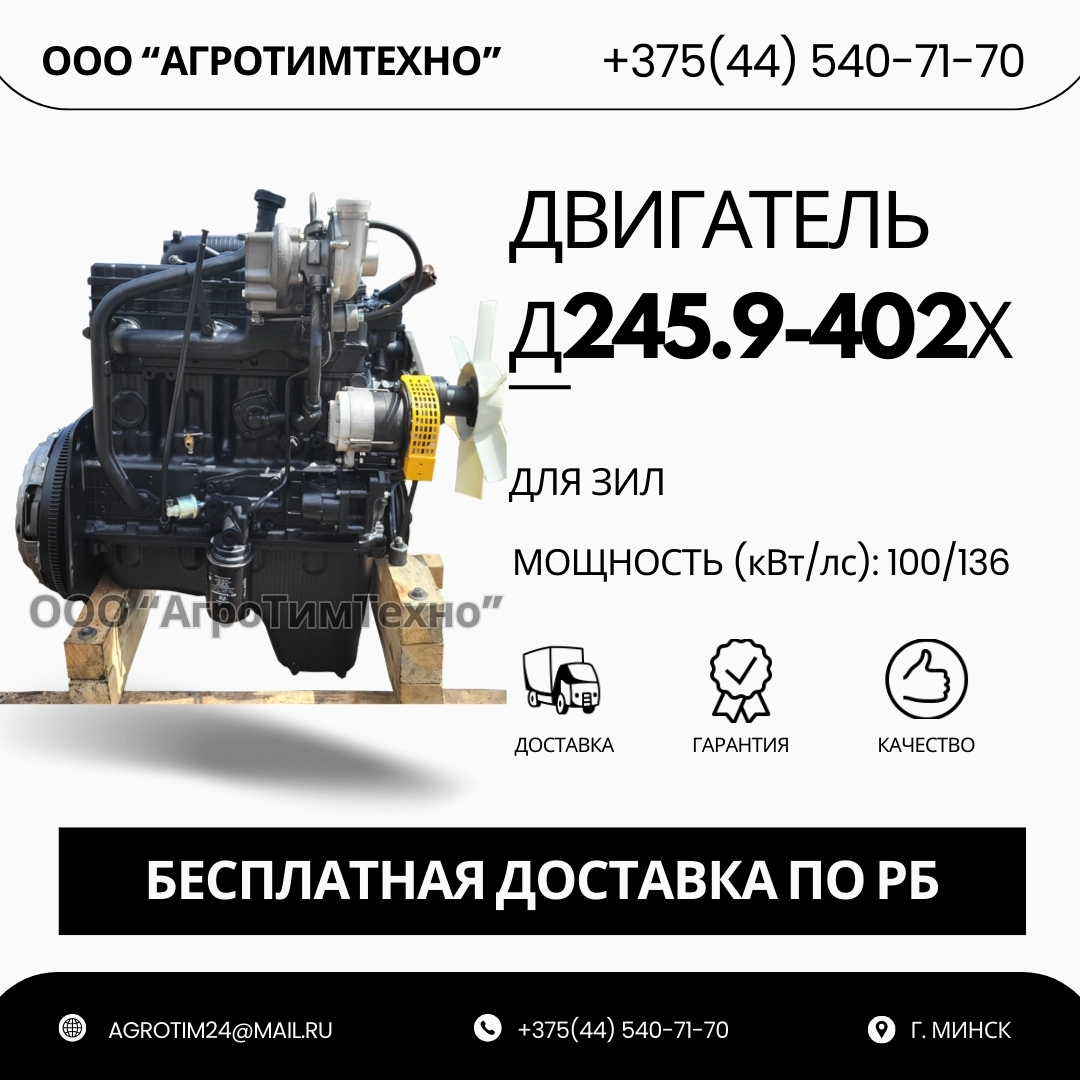 Капитальный ремонт двигателя ММЗ Д245.9-402х для зил или двигатель с обменного фонда (цену на ремонт ДВС и наличие указанной модификации двигателя в ремфонде уточнять!). Забор двигателя и доставка после капитального ремонта осуществляется Исполнителем (ООО «АгроТимТехно») БЕСПЛАТНО. При наличии двигателя в обменном фонде доставка осуществляется в течение 1-2 дней после оплаты.