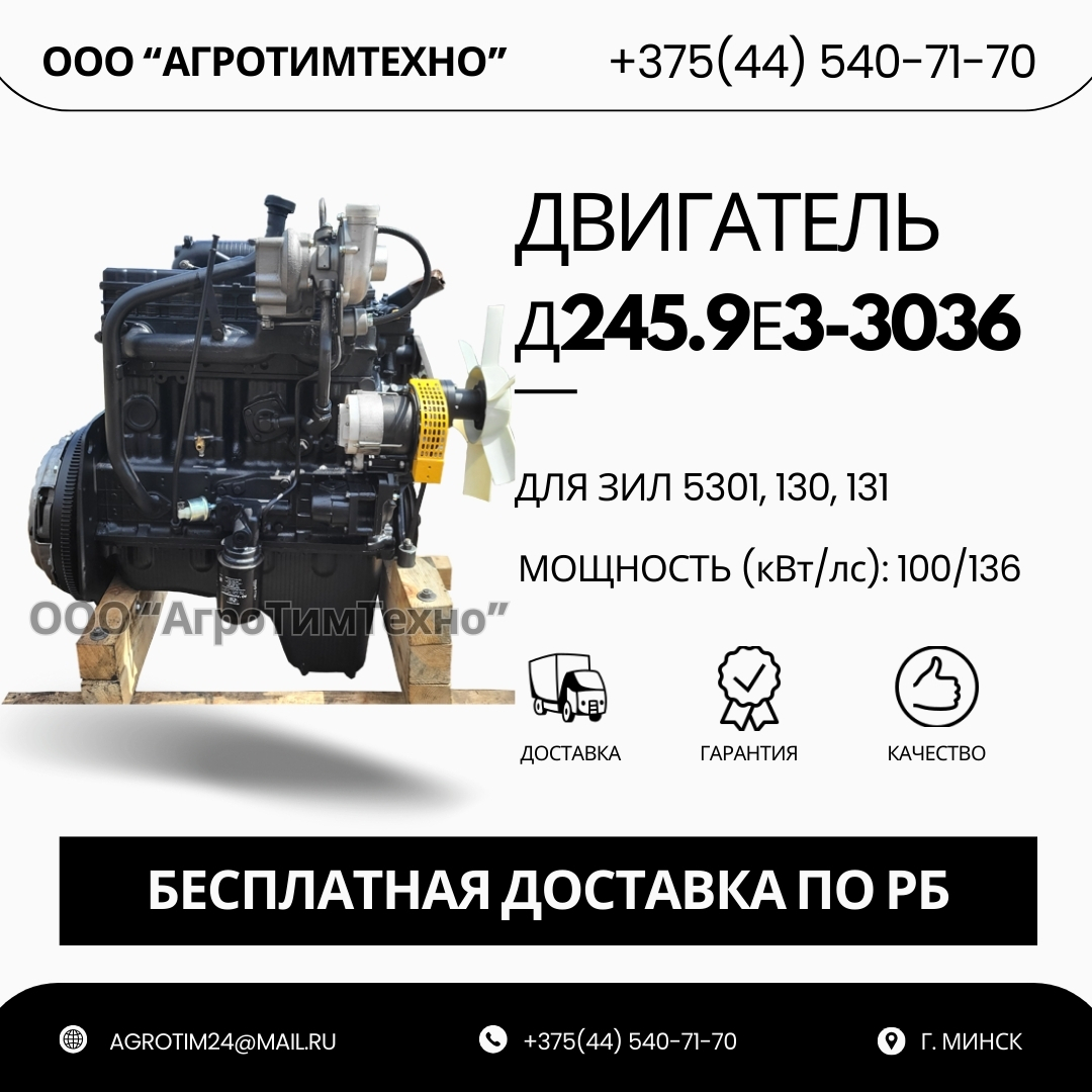Капитальный ремонт двигателя ММЗ Д245.9е3-3036 для зил 5301, 130,131 или двигатель с обменного фонда (цену на ремонт ДВС и наличие указанной модификации двигателя в ремфонде уточнять!). Забор двигателя и доставка после капитального ремонта осуществляется Исполнителем (ООО «АгроТимТехно») БЕСПЛАТНО. При наличии двигателя в обменном фонде доставка осуществляется в течение 1-2 дней после оплаты.