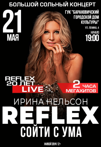 "Сойти с ума", "Non Stop", "Люблю", "Танцы", "Потому что не было тебя", "Первый раз" и другие хиты, которые вы все знаете наизусть. Всегда стильная музыкальная группа REFLEX и ее бессменная солистка Ирина Нельсон продолжают радовать нас новыми хитами и большими сольными концертами.
