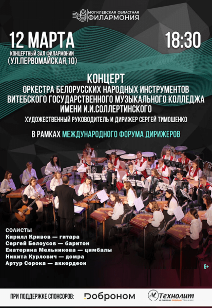 В рамках международного форума дирижеров 12 марта в 18.30 в концертном зале филармонии состоится концертное выступление обладателя Гран-при конкурса имени Л.Л. Иванова (2024) оркестра белорусских народных инструментов Витебского государственного музыкального колледжа имени И.И.Соллертинского (художественный руководитель и дирижер Сергей Тимошенко).