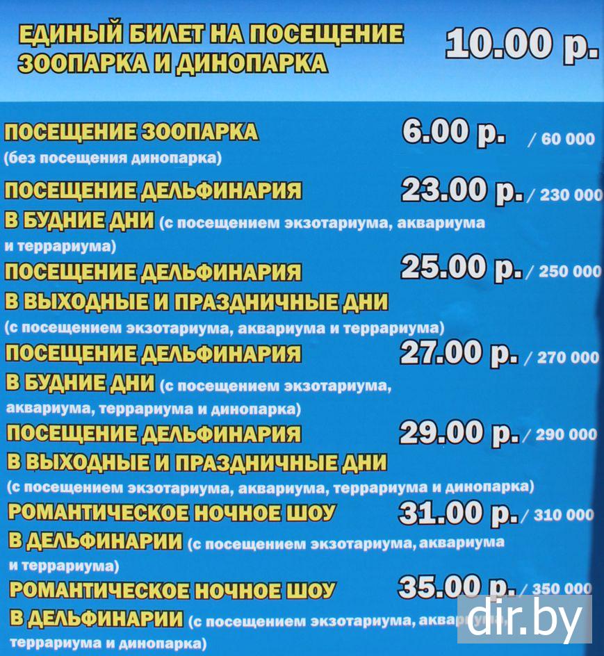 Один билет стоит 29 бел. руб. с посещением Дельфинария, Динопарка, Зоопарка(клетка, вольеры, аквариум, экзотариум).